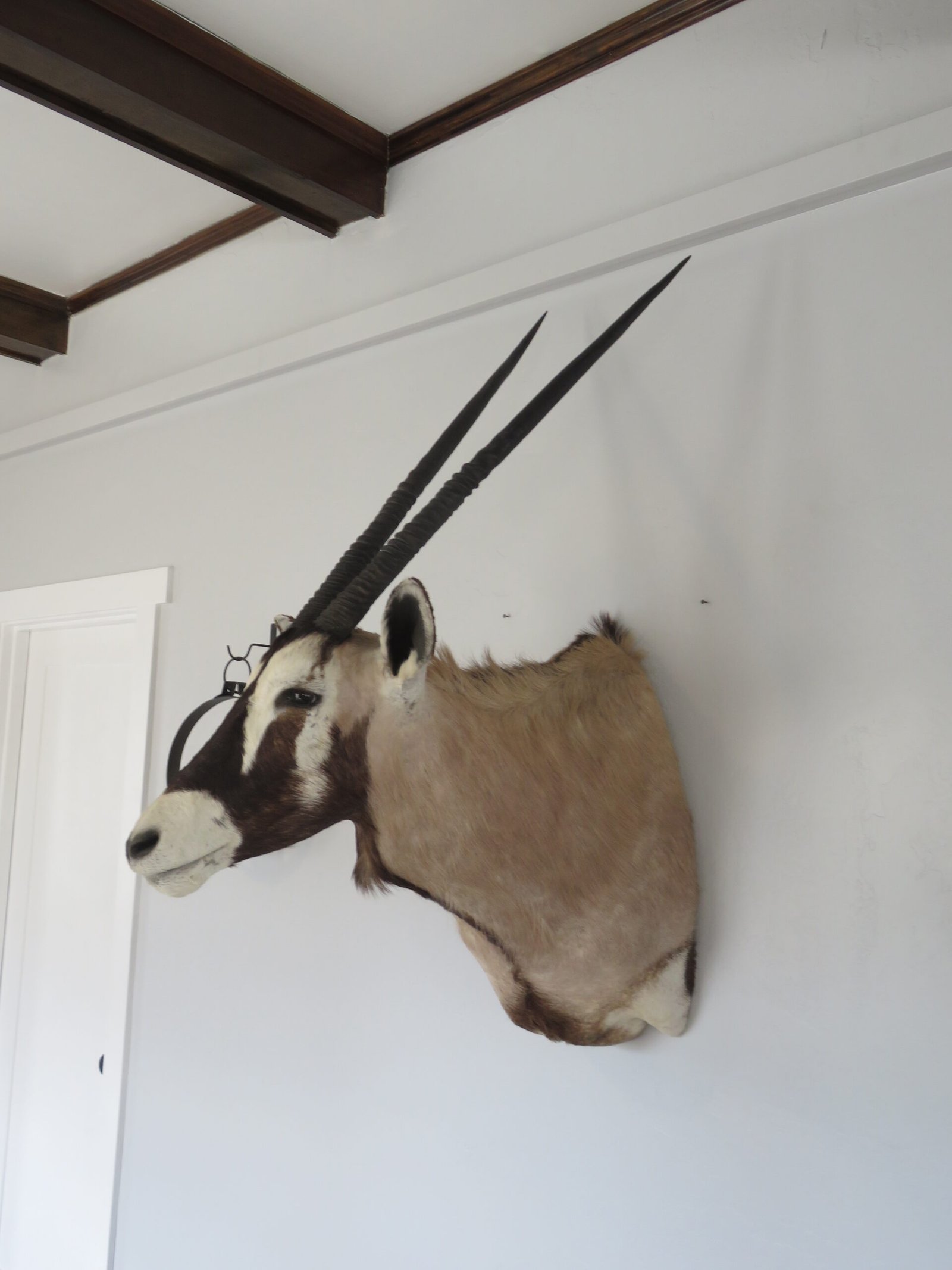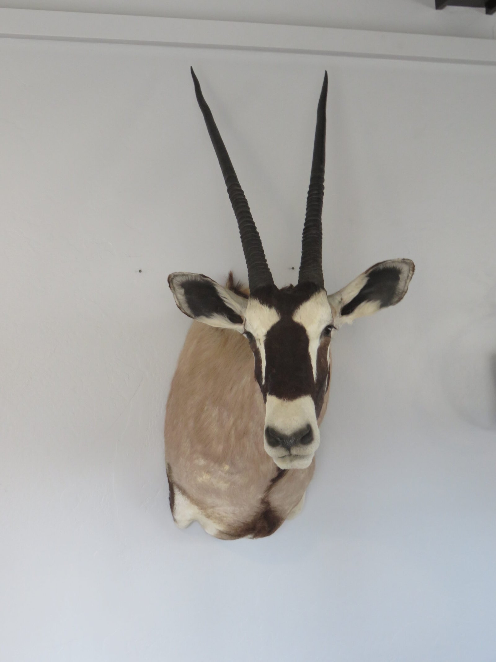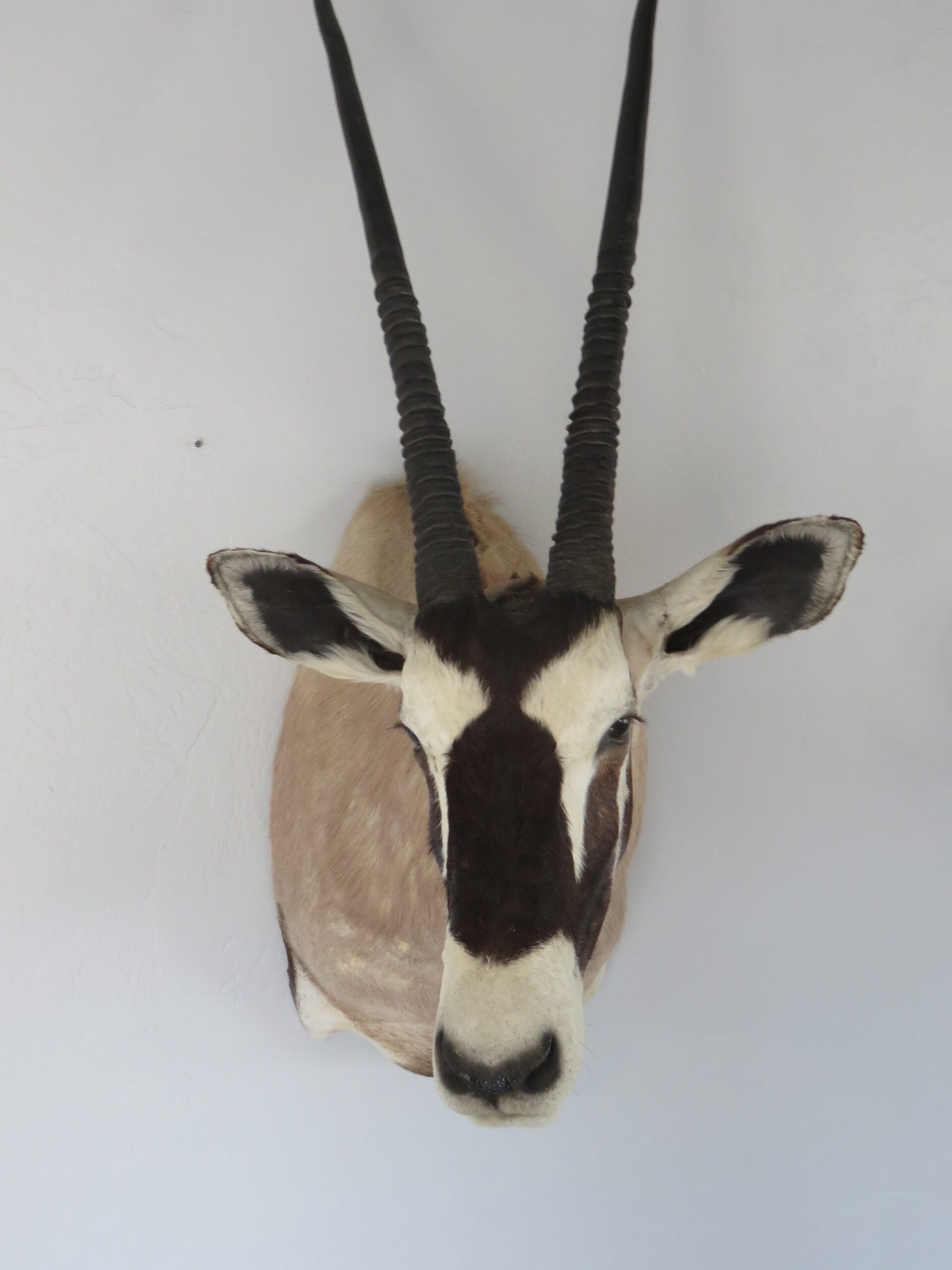 Here we have available a beautiful African Gemsbok. Nice head up pose with a slight turn to the right, facing into the room. A nice bull with horns just over 31″ each, having 6 1/8″ base circumferences. It has great coloring and pattern, which are typical for the species. Excellent quality workmanship on this mount.
